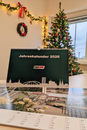 Ab sofort ist der neue SVF-Jahreskalender 2026 in unseren Kundenzentren erhältlich. Der hochwertig gestaltete Kalender zeigt eine Auswahl der schönsten Motive aus den vergangenen Monaten und bildet die ganze Vielfalt des Frankfurter Nahverkehrs ab – mit Bussen und Bahnen vor typischer Frankfurter Kulisse. Unsere SVF Foto-AG stellte uns freundlicherweise die gesamten Fotomotive zur Verfügung.